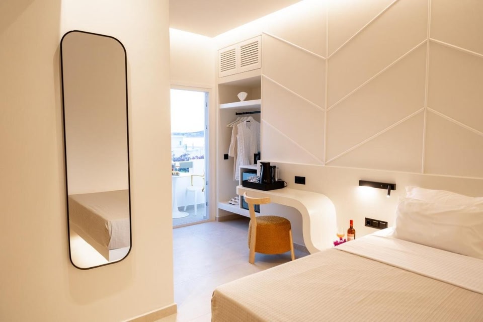 At Rooms Mike Paros you can check in from 13:00, and you'll need to check out before 11:00.