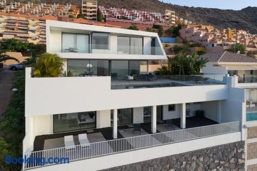 Boasting air-conditioned accommodation with a private pool, mountain view and a balcony, Karat Villa Kai Torviscas is set in Adeje. With garden views, this accommodation offers a patio.