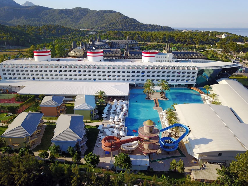 Designed to resemble a ship, this 5-star resort in Kemer enjoys a long stretch of sandy beach and an amazing pool scene with an aquapark. Personalised spa treatments include exotic massages. License number: 20140